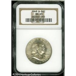 1949-D 50C MS65 NGC. Bright and lustrous with scat <B>1949-D 50C MS65 NGC.</B></I> Bright and lustrous with scattered golden-russet toning and a few contact marks. <BR><BR><B>Important notice:</B> Heritage usually auctions material at the rate of 200-250 lots per hour. On some occasions eBay Live bid software or the Internet may not be able to keep up with the pace of the auction. We recommend placing a realistic absentee bid now as insurance to avoid disappointment. Occasionally the auctioneer may eliminate or reject an eBay Live bid, and the auctioneer may also reopen a lot after the close of the eBay live bidding (usually because we missed an audience bid), and may reject your bid even if it shows you as the winning bidder. By bidding via eBay Live, you agree that Heritage may award the lot to another bidder at its sole discretion under the circumstances described above or any other reasonable circumstances. Since eBay bids are not shown to us until we open the lot on the floor, we treat those bids just like floor bids. In most cases the floor responds before the eBay bid is presented to us, due to Internet lag time, so for consistency we have made it a policy that floor bids are always considered first over tie eBay live bids. Also please note that all Heritage lots purchased through eBay Live carry a 20% Buyer's Premium. Please make sure you read the Terms and Conditions before you bid. This lot is being auctioned in conjunction with a live floor auction by Heritage Galleries & Auctioneers. All final auction and invoice information will be supplied by Heritage Galleries & Auctioneers, and all other information should be considered preliminary. Lot:6313
