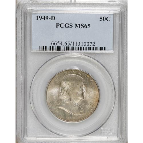 <B>1949-D 50C MS65 PCGS.</B></I> PCGS Population (37/1). NGC Census: (93/2). Mintage: 4,120,600. Numismedia Wsl. Price: $620. (#6654)<BR><BR><b>Shipping:</b> Coins & Currency (<a target="_blank" href="http://www.heritageauctions.com/common/shipping.php">view shipping information</a>)