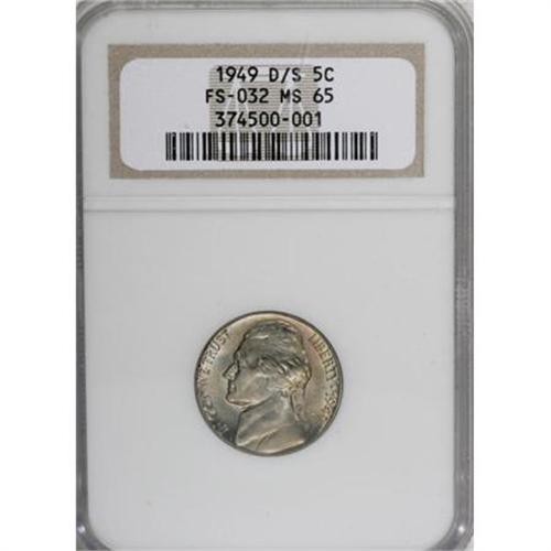 <B>1949-D/S 5C MS65 NGC.</B></I> FS-032. NGC Census: (14/12). PCGS Population (172/47). Mintage: 36,498,000. Numismedia Wsl. Price for NGC/PCGS coin in MS65: $454. (#4039)<BR><BR><B>Coin Engraver:</B> Felix Schlag<BR><BR><b>Shipping:</b> Coins & Currency (<a target="_blank" href="http://www.heritageauctions.com/common/shipping.php">view shipping information</a>)