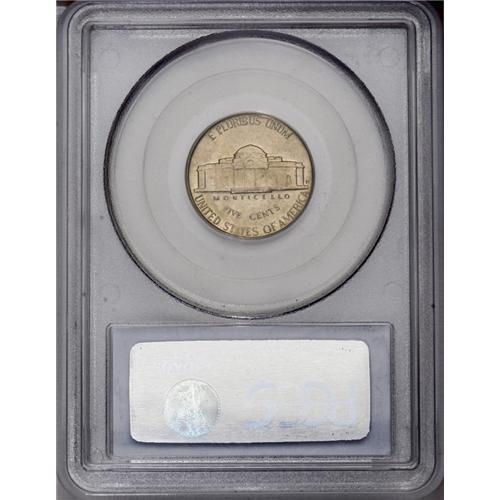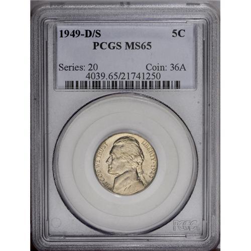 <B>1949-D/S<5C> MS65 PCGS.</B></I> FS-032. The upper curve of an S mintmark is obvious northwest of the prominent D mintmark. A pleasing example that has dusky gray-gold patina, a reasonable strike, and well preserved surfaces. Monticello is softly struck and shows a moderate mark at the top of the second column from the left. A few small abrasions are also noted on Jefferson's jaw and cheekbone. Overall, however, a solid Gem example of this overmintmark variety. Population: 149 in 65, 32 finer (1/06).