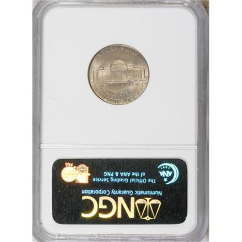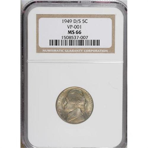 <B>1949-D/S 5C MS66 NGC.</B></I> FS-501, formerly FS-032. According to the <I>Cherrypickers' Guide,</B></I> "This variety is quite rare in mint state, and highly sought after." The strike is slightly soft on the mintmark, but the diagnostic features are evident. Peach, lilac, and yellow-gold enrich this lustrous and unmarked Premium Gem. A few pinpoint flecks decide the grade. Census: 12 in 66, 0 finer (5/07).<BR><BR><b>Shipping:</b> Coins & Currency (<a target="_blank" href="http://www.heritageauctions.com/common/shipping.php">view shipping information</a>)