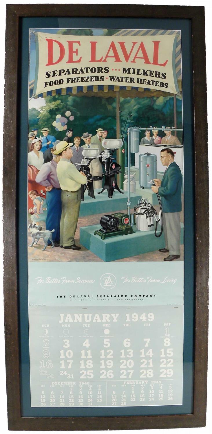 1949 De Laval Separators and Milkers Calendar. Calendar cover sheet attached to back side. Excellent colors and graphics. Framed under glass. Some very minor staining at top otherwise excellent condition. 18 X 43 inches.