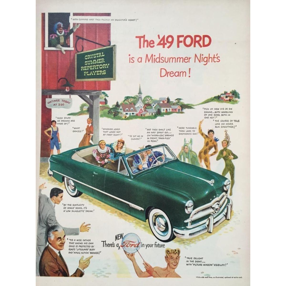Original 1949 magazine advertisement for Ford Motors. Illustration depicting a green convertible surrounded by the Crystal Summer Repertory Players in "Midsummer Night's Dream" costumes. Slogan reads, " The '49 Ford is a Midsummer Night's Dream! 11" X 14" mounted on archival linen canvas for preservation.