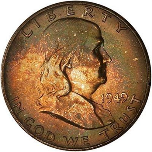 Deep, wonderful toning sets this 1949 half dollar apart from the rest. Mint frostiness like brilliant frosted glass gives this coin much of its life and pizzazz as it causes the toning to gleam with iridescence.