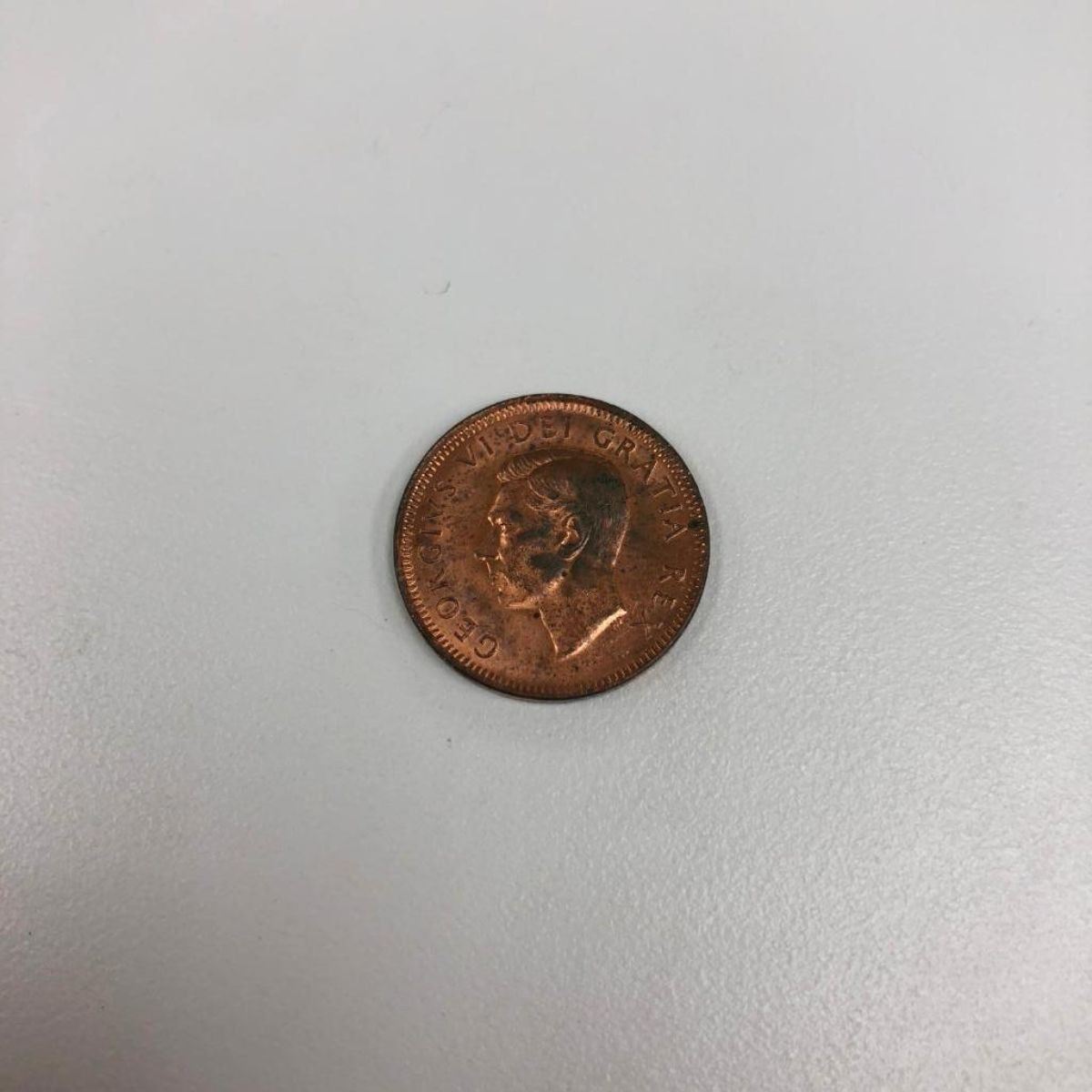Obverse The portrait in left profile of George VI is surrounded with the inscription "GEORGIVS VI DEI GRATIA REX" (George VI, King by the grace of God) Lettering: GEORGIVS VI DEI GRATIA REX HP Engraver: Thomas Humphrey Paget Reverse A maple leaf twig is surrounded with the face value and the inscription "CANADA" Lettering: 1 CENT 1949 K · G CANADA Engraver: George Kruger Gray Specifications Country: Canada Type: Standard circulation coin Years: 1948-1952 Value: 1 Cent (0.01 CAD) Composition: Bronze (.980 Cu, .005 Sn, .015 Zn) Weight: 3.24 g Diameter: 19.05 mm Thickness: 1.65 mm Shape: Round