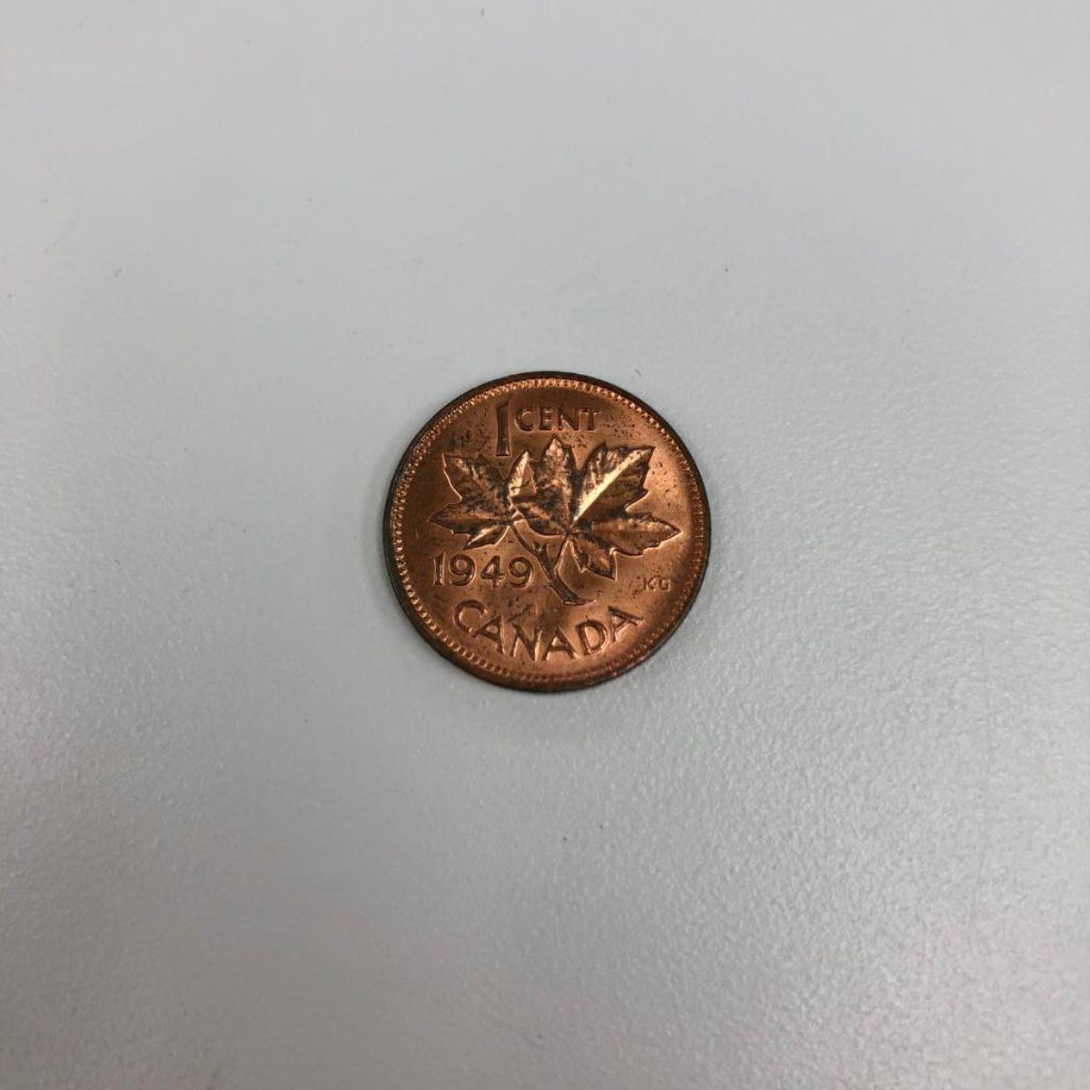 Obverse The portrait in left profile of George VI is surrounded with the inscription "GEORGIVS VI DEI GRATIA REX" (George VI, King by the grace of God) Lettering: GEORGIVS VI DEI GRATIA REX HP Engraver: Thomas Humphrey Paget Reverse A maple leaf twig is surrounded with the face value and the inscription "CANADA" Lettering: 1 CENT 1949 K · G CANADA Engraver: George Kruger Gray Specifications Country: Canada Type: Standard circulation coin Years: 1948-1952 Value: 1 Cent (0.01 CAD) Composition: Bronze (.980 Cu, .005 Sn, .015 Zn) Weight: 3.24 g Diameter: 19.05 mm Thickness: 1.65 mm Shape: Round