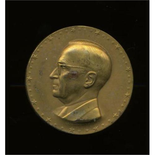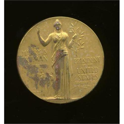 <B>1949 Harry S. Truman Inaugural Medal, Extra Fine Uncertified.</B></I> Dusterburg OIM 23B51, MacNeil HST 1949-3. Gilt bronze, 51 mm. Obverse bust of a bespectacled Truman facing left, stars encircling. Reverse female figure in center, crowd scene, HARRY S. TRUMAN INAUGURATED PRESIDENT OF THE UNITED STATES JANUARY 20, 1949. Some highpoint wear with removal of the gilding is noted on each side. Only 7,500 examples of the bronze were struck.<BR><BR><b>Shipping:</b> Coins & Currency (<a target="_blank" href="http://www.heritageauctions.com/common/shipping.php">view shipping information</a>)