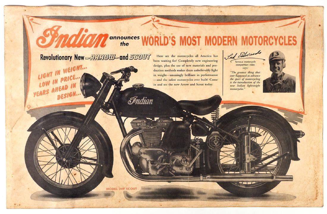 Advertisment poster from Indian Motorcycles promoting the Scout 249, which was only produced during a 3-year period. Poster dates to 1949. Poster measures 14" x 22".