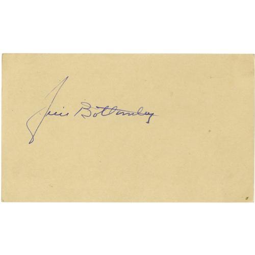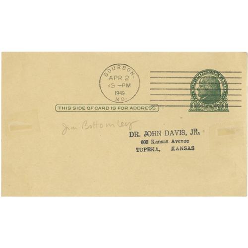 <B>1949 Jim Bottomley Signed Government Postcard.</B></I> One the greatest stars of the fabled St. Louis Cardinals teams of the 1920's, Sunny Jim remains a significant challenge for collectors of Hall of Fame autographs, having passed fifteen years before his posthumous induction. His blue ink signature on this postcard mailed from a St. Louis suburb rates a marvelous 9+/10. Postcard itself is likewise in fine condition. <I>LOA from PSA/DNA. LOA from James Spence Authentication.</B></I><BR><BR><b>Shipping:</b> Sportscard (<a target="_blank" href="http://www.heritageauctions.com/common/shipping.php">view shipping information</a>)