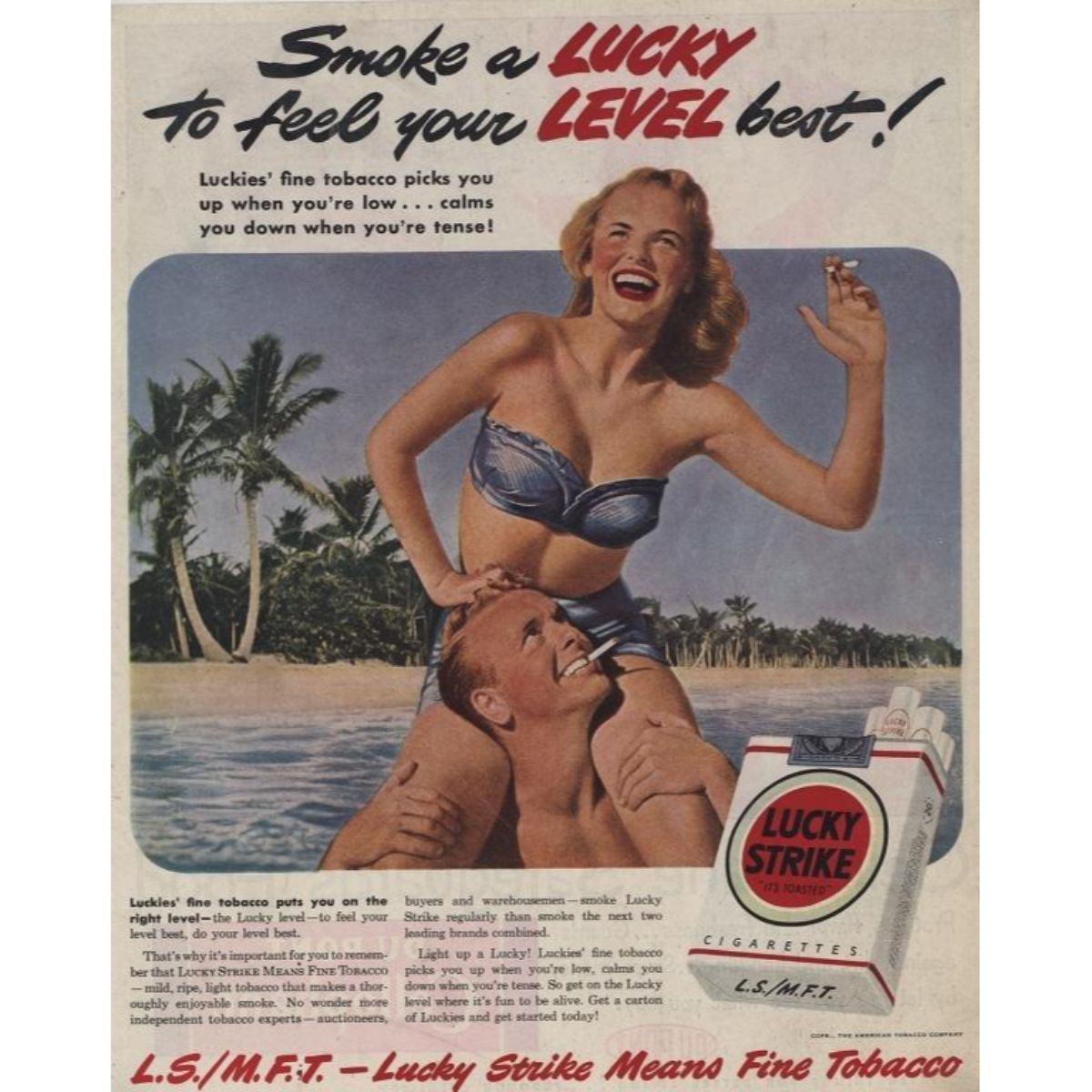 Original 1949 magazine advertisement for Lucky Strikes Cigarettes. the theme for this particular year of advertising was " Smoke a Lucky to feel your level best!" Features a bikini clad woman, with cigarette in hand.