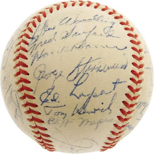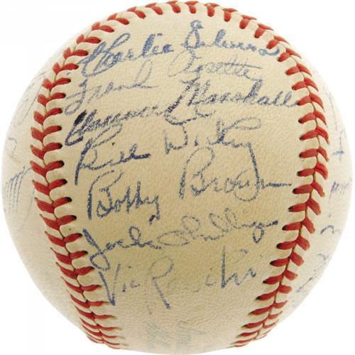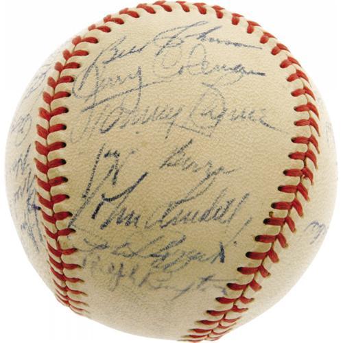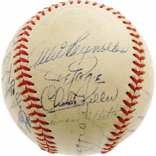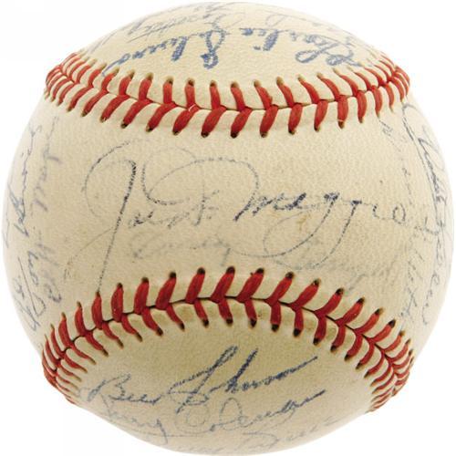 <B>1949 New York Yankees Team Signed Baseball.</B></I> Despite posting just a single winning season in eight years of Big League managing, Casey Stengel earned the role of skipper of the New York Yankees in 1949 amidst the loud protestations of local sportswriters and fans alike. Come October, however, all Bronx faithful were singing a much different tune, as the Ol' Perfesser led the club to its first of five consecutive World Championship crowns. Here Mr. Stengel shares the sweet spot with the other king in pinstripes, Joe DiMaggio, joining twenty-five Yanks on this OAL (Harridge) ball including Berra, Dickey, Henrich, Rizzuto, Crosetti, Bauer, Woodling, Reynolds and more. Signature quality ranges from a legible 3/10 to 9/10, with all but a handful rating 7/10 or better. <I>LOA from PSA/DNA.</B></I> <BR><BR><B>Important notice:</B> Heritage usually auctions material at the rate of 200-250 lots per hour. On some occasions eBay Live bid software or the Internet may not be able to keep up with the pace of the auction. We recommend placing a realistic absentee bid now as insurance to avoid disappointment. Occasionally the auctioneer may eliminate or reject an eBay Live bid, and the auctioneer may also reopen a lot after the close of the eBay live bidding (usually because we missed an audience bid), and may reject your bid even if it shows you as the winning bidder. By bidding via eBay Live, you agree that Heritage may award the lot to another bidder at its sole discretion under the circumstances described above or any other reasonable circumstances. Since eBay bids are not shown to us until we open the lot on the floor, we treat those bids just like floor bids. In most cases the floor responds before the eBay bid is presented to us, due to Internet lag time, so for consistency we have made it a policy that floor bids are always considered first over tie eBay live bids. Also please note that all Heritage lots purchased through eBay Live carry a 22.5% Buyer's Premium. Please make sure you read the Terms and Conditions before you bid. This lot is being auctioned in conjunction with a live floor auction by Heritage Galleries & Auctioneers. All final auction and invoice information will be supplied by Heritage Galleries & Auctioneers, and all other information should be considered preliminary. Lot:19403 <BR><BR><B>Winning Notification and Billing:</B> After the FINAL session in this auction is complete, Heritage will send e-mail and snail mail invoices. This process normally takes several days. All final auction and invoice information will be supplied by Heritage Galleries & Auctioneers, and all other information should be considered preliminary. <BR><BR>This auction will be conducted on a live auction floor and over the Internet through eBay Live. If you choose to place an absentee bid, please take a moment to <font color='#0000ff'><u><a href='http://pages.ebay.com/liveauctions/help/before/laabsentee.html'>learn how eBay Live absentee bidding works</a></u></font><font color='#000000'>