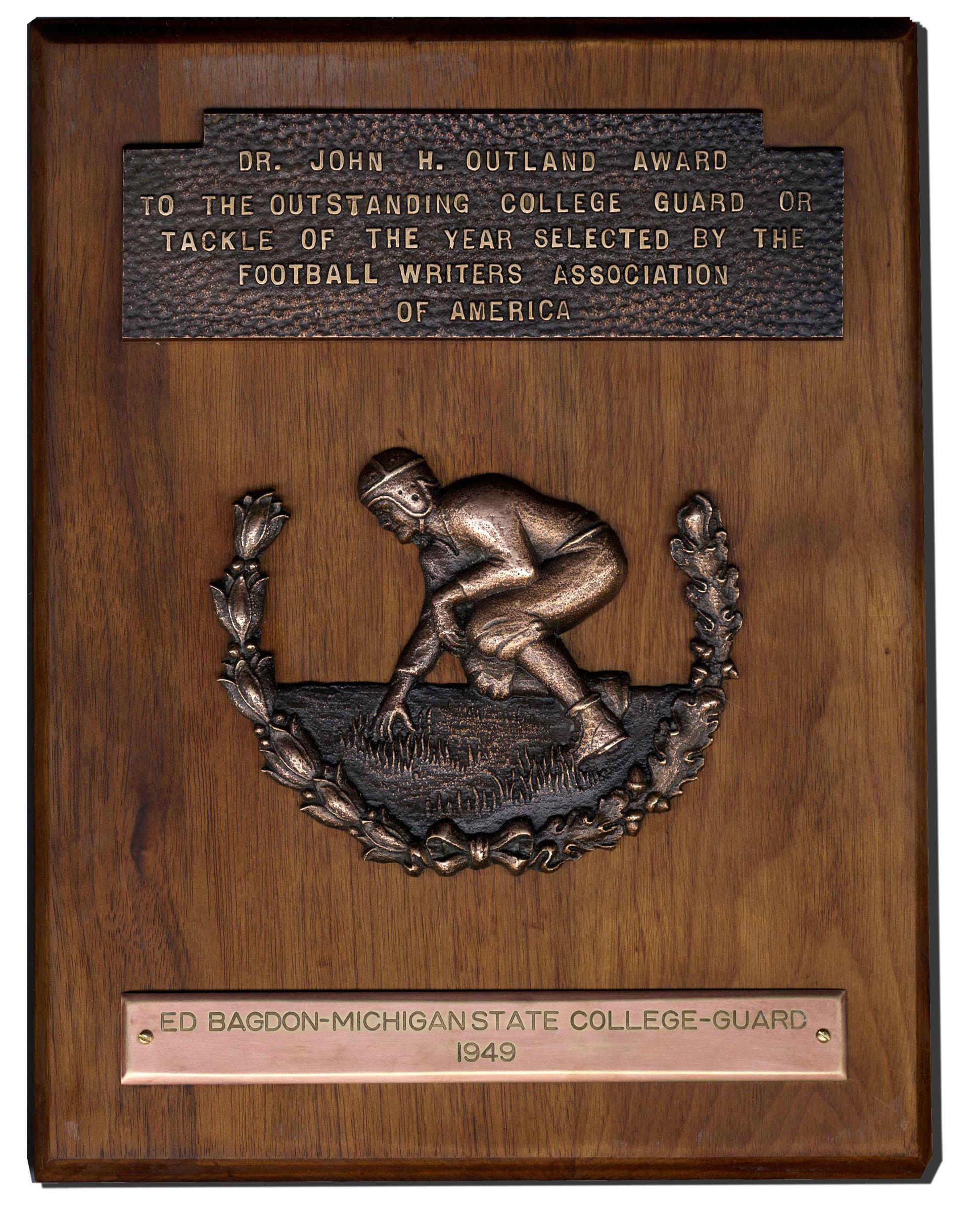Fourth annual Outland Award presented in 1949 to Michigan State guard Ed Bagdon. Dr. John Outland conceived the award in 1946 to recognize the position of interior lineman in college football. The plaque has a bronze figure of a lineman adorning a leather helmet in a two-point stance with his hand on the turf. The top reads, ''Dr. John H. Outland Award to the Outstanding College Guard or Tackle of the Year Selected by the Football Writers Association of America''. At the bottom, engraved on a copper strip, ''Ed Bagdon-Michigan State College-Guard 1949''. Plaque measures 9.25'' x 12.5'', in near fine condition with light scratching. One of college football's most prestigious awards, this is the oldest Outland Trophy to go on the auction market.
