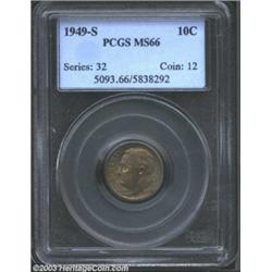 <TABLE cellSpacing=0 cellPadding=0 width="100%" bgColor=#000000 border=0><TBODY><TR><TD width="100%"><TABLE cellSpacing=1 cellPadding=3 width="100%" border=0><TBODY><TR><TD width="100%" bgColor=#79735c><FONT face=arial color=#ffffff size=3><B>Description</B> </FONT></TD></TR><TR><TD width="100%" bgColor=#ffffff><FONT face=arial size=2><B>1949-S 10C MS66 PCGS.</B></I> Gold and violet intermingle on this attractively toned superb Gem. Well preserved with only the most minor imperfections. </FONT></TD></TR></TBODY></TABLE></TD></TR></TBODY></TABLE><BR><A name=PricesRealized></A><TABLE cellSpacing=0 cellPadding=0 width="100%" bgColor=#000000 border=0><TBODY><TR><TD width="100%"><TABLE cellSpacing=1 cellPadding=3 width="100%" border=0><TBODY><TR><TD width="100%" bgColor=#79735c><A name=PR><FONT face=arial color=#ffffff size=3><B>Previous Prices from Heritage Auctions</B> </FONT></A></TD></TR><TR><TD bgColor=#f6f6ed><TABLE cellSpacing=0 cellPadding=0 width="100%" border=1><TBODY><TR><TD align=middle width="33%"><B>Date</B></TD><TD align=middle width="33%"><B>Service</B></TD><TD align=middle width="33%"><B>Price</B></TD></TR><TR bgColor=whitesmoke><TD width="33%"><B>11/26/2002</B></TD><TD width="33%">PCGS</TD><TD width="33%">$52.90</TD></TR><TR bgColor=whitesmoke><TD width="33%"><B>03/12/2002</B></TD><TD width="33%">PCGS</TD><TD width="33%">$23.00</TD></TR><TR bgColor=whitesmoke><TD width="33%"><B>03/12/2002</B></TD><TD width="33%">PCGS</TD><TD width="33%">$48.30</TD></TR><TR bgColor=whitesmoke><TD width="33%"><B>06/18/2002</B></TD><TD width="33%">ANACS</TD><TD width="33%">$31.05</TD></TR><TR bgColor=whitesmoke><TD width="33%"><B>08/14/2001</B></TD><TD width="33%">ANACS</TD><TD width="33%">$41.00</TD></TR><TR bgColor=whitesmoke><TD width="33%"><B>06/02/2001</B></TD><TD width="33%">PCGS</TD><TD width="33%">$40.25</TD></TR><TR bgColor=whitesmoke><TD width="33%"><B>06/13/2000</B></TD><TD width="33%">PCGS</TD><TD width="33%">$14.00</TD></TR><TR bgColor=whitesmoke><TD width="33%"><B>12/05/2000</B></TD><TD width="33%">PCGS</TD><TD width="33%">$50.00</TD></TR><TR bgColor=whitesmoke><TD width="33%"><B>06/17/2003</B></TD><TD width="33%">PCGS</TD><TD width="33%">$44.85</TD></TR><TR bgColor=whitesmoke><TD width="33%"><B>12/19/2000</B></TD><TD width="33%">NGC</TD><TD width="33%">$23.00</TD></TR><TR bgColor=whitesmoke><TD width="33%"><B>12/12/2000</B></TD><TD width="33%">ANACS</TD><TD width="33%">$26.00</TD></TR></TBODY></TABLE></TD></TR><TR><TD bgColor=#ffffff><FONT face=arial size=1 ?>PLEASE NOTE: All prices realized reflect the final hammer price PLUS the buyer's premium in auctions that charge a buyer's premium. Each item has a notation at the top of the listing indicating whether that lot included a buyer's premium. Example: A item that sells with a final hammer price of $100 and a 20% buyer's premium will display with a price realized of $120. All information listed is intended to be as accurate as possible, but errors are possible. Please use this guide carefully and inform us of any inaccuracies. </FONT></TD></TR></TBODY></TABLE></TD></TR></TBODY></TABLE><BR><TABLE cellSpacing=0 cellPadding=0 width="100%" bgColor=#000000 border=0><TBODY><TR><TD width="100%"><TABLE cellSpacing=1 cellPadding=3 width="100%" border=0><TBODY><TR><TD width="100%" bgColor=#79735c colSpan=6><FONT face=arial color=#ffffff size=3><B>Price Guide*</B> </FONT></TD></TR><TR bgColor=#f6f6ed><TD align=middle><B>Grade</B> </TD><TD align=middle><B>Coin World<BR>(Trends)</B> </TD><TD align=middle><B>Numismedia<BR>Retail</B> </TD><TD align=middle><B>Numismedia<BR>Wholesale</B> </TD><TD align=middle><B>Coin<BR>Universe</B> </TD><TD align=middle><B>Heritage<BR>Value Index</B> </TD></TR><TR bgColor=#ffffff><TD align=middle>65</TD><TD align=right>---</TD><TD align=right>$38.00</TD><TD align=right>$30.00</TD><TD align=right>$40.00</TD><TD align=right>$24.50</TD></TR><TR style="FONT-WEIGHT: bold" bgColor=#cccfdd><TD align=middle>66</TD><TD align=right>---</TD><TD align=right>$63.00</TD><TD align=right>$50.00</TD><TD align=right>$75.00</TD><TD align=right>$53.75</TD></TR><TR bgColor=#ffffff><TD align=middle>67</TD><TD align=right>---</TD><TD align=right>$100.00</TD><TD align=right>$80.00</TD><TD align=right>$200.00</TD><TD align=right>$91.50</TD></TR><TR bgColor=#ffffff><TD colSpan=6><FONT size=1>*All information listed is intended to be as accurate as possible, but errors are possible. No item may be returned or refused based on this information which is provided as a service to our customers. You should contact each pricing source directly to determine the accuracy of this information. </FONT></TD></TR></TBODY></TABLE></TD></TR></TBODY></TABLE><BR><TABLE cellSpacing=0 cellPadding=0 width="100%" bgColor=#000000 border=0><TBODY><TR><TD width="100%"><TABLE cellSpacing=1 cellPadding=3 width="100%" border=0><TBODY><TR><TD width="100%" bgColor=#79735c><FONT face=arial color=#ffffff size=3><B>Population Guide</B> </FONT></TD></TR><TR bgColor=#ffffff><TD align=middle><!-- Begin Output of Population Grid--><TABLE cellSpacing=0 cellPadding=0 width="100%" border=0><TBODY><TR><TD vAlign=center><TABLE cellSpacing=0 width="100%" border=1 cellsadding="3"><TBODY><TR><TD vAlign=center><TABLE cellSpacing=0 cellPadding=3 width="100%" border=1><TBODY><TR><TD vAlign=center align=middle bgColor=#f0f1e8 colSpan=2 <CENTER><FONT face=Arial size=2><B>PCGS Pop </B></FONT><CENTER></CENTER></TD><TD vAlign=center align=middle bgColor=#f0f1e8 colSpan=2><CENTER><FONT face=Arial size=2><B>NGC Pop</B></CENTER></FONT></TD></TR><TR><TD vAlign=center><FONT face=Arial size=2>(66)</FONT> </TD><TD vAlign=center align=right><FONT face=Arial size=2>682</FONT> </TD><TD vAlign=center><FONT face=Arial size=2>(66)</FONT> </TD><TD vAlign=center align=right><FONT face=Arial size=2>387</FONT> </TD></TR><TR><TD vAlign=center><FONT face=Arial size=2>(>66)</FONT> </TD><TD vAlign=center align=right><FONT face=Arial size=2>117</FONT> </TD><TD vAlign=center><FONT face=Arial size=2>(>66)</FONT> 