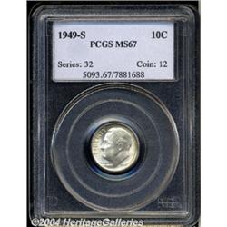<B>1949-S<10C> MS67 PCGS.</B></I> Speckled orange-olive toning is more noticeable on the reverse. The lustrous surfaces are essentially devoid of marks, and the design features are adequately struck. <BR><BR><B>Important notice:</B> Heritage usually auctions material at the rate of 200-250 lots per hour. On some occasions eBay Live bid software or the Internet may not be able to keep up with the pace of the auction. We recommend placing a realistic absentee bid now as insurance to avoid disappointment. Occasionally the auctioneer may eliminate or reject an eBay Live bid, and the auctioneer may also reopen a lot after the close of the eBay live bidding (usually because we missed an audience bid), and may reject your bid even if it shows you as the winning bidder. By bidding via eBay Live, you agree that Heritage may award the lot to another bidder at its sole discretion under the circumstances described above or any other reasonable circumstances. Since eBay bids are not shown to us until we open the lot on the floor, we treat those bids just like floor bids. In most cases the floor responds before the eBay bid is presented to us, due to Internet lag time, so for consistency we have made it a policy that floor bids are always considered first over tie eBay live bids. Also please note that all Heritage lots purchased through eBay Live carry a 20% Buyer's Premium. Please make sure you read the Terms and Conditions before you bid. </span></font></tr></table></td></tr></table>