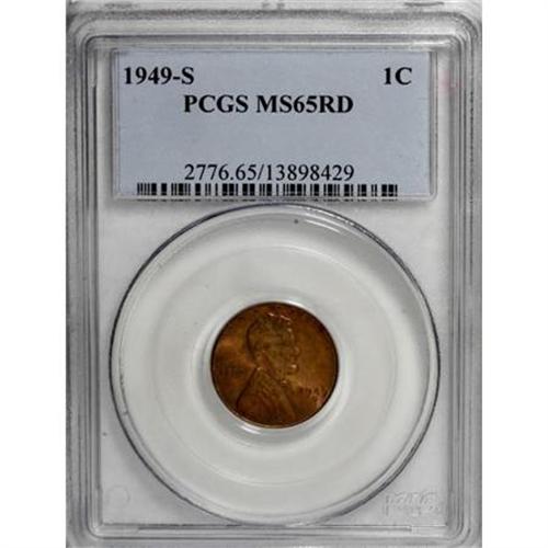 <B>1949-S 1C MS65 Red PCGS.</B></I> Intense fire-red, lime-green, and gold coloration decorates the bright, lustrous surfaces of this carefully preserved Gem. The design elements are boldly struck on both sides, and surface marks are minor. <BR><BR><B>Coin Engraver:</B> Victor D. Brenner<BR><BR><b>Shipping:</b> Coins & Currency (<a target="_blank" href="http://www.heritageauctions.com/common/shipping.php">view shipping information</a>)