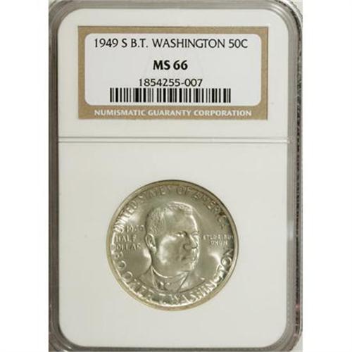 <B>1949-S 50C Booker T. Washington MS66 NGC.</B></I> NGC Census: (282/29). PCGS Population (292/14). Mintage: 6,004. Numismedia Wsl. Price for NGC/PCGS coin in MS66: $224. (#9418)<BR><I>From The Frank DuVall Collection of U.S. Commemoratives.</B></I><BR><BR><b>Shipping:</b> Coins & Currency (<a target="_blank" href="http://www.heritageauctions.com/common/shipping.php">view shipping information</a>)