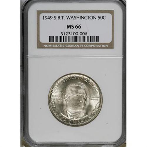 <B>1949-S 50C Booker T. Washington MS66 NGC.</B></I> NGC Census: (301/35). PCGS Population (328/14). Mintage: 6,004. Numismedia Wsl. Price for NGC/PCGS coin in MS66: $224. (#9418)<BR><BR><b>Shipping:</b> Coins & Currency (<a target="_blank" href="http://www.heritageauctions.com/common/shipping.php">view shipping information</a>)