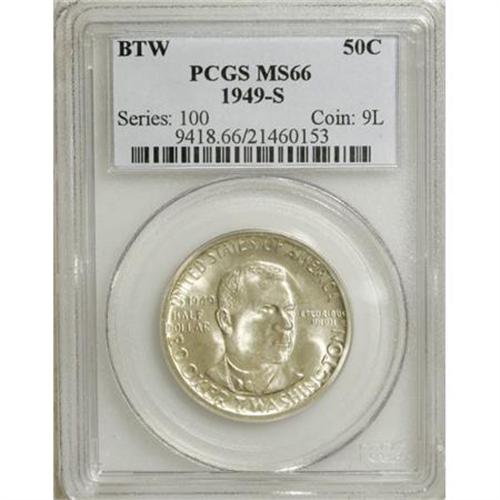 <B>1949-S 50C Booker T. Washington MS66 PCGS.</B></I> PCGS Population (292/14). NGC Census: (280/29). Mintage: 6,004. Numismedia Wsl. Price for NGC/PCGS coin in MS66: $224. (#9418)<BR><BR><b>Shipping:</b> Coins & Currency (<a target="_blank" href="http://www.heritageauctions.com/common/shipping.php">view shipping information</a>)