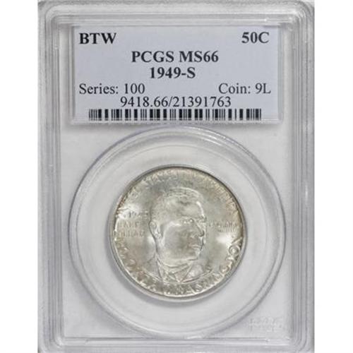 <B>1949-S 50C Booker T. Washington MS66 PCGS.</B></I> PCGS Population (292/14). NGC Census: (280/29). Mintage: 6,004. Numismedia Wsl. Price for NGC/PCGS coin in MS66: $224. (#9418)<BR><BR><b>Shipping:</b> Coins & Currency (<a target="_blank" href="http://www.heritageauctions.com/common/shipping.php">view shipping information</a>)