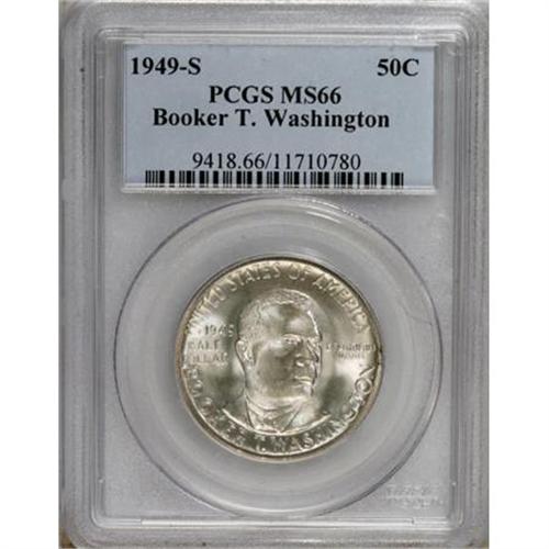 <B>1949-S 50C Booker T. Washington MS66 PCGS.</B></I> PCGS Population (304/14). NGC Census: (285/29). Mintage: 6,004. Numismedia Wsl. Price for NGC/PCGS coin in MS66: $224. (#9418)<BR><BR><b>Shipping:</b> Coins & Currency (<a target="_blank" href="http://www.heritageauctions.com/common/shipping.php">view shipping information</a>)