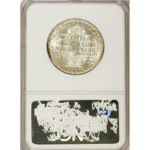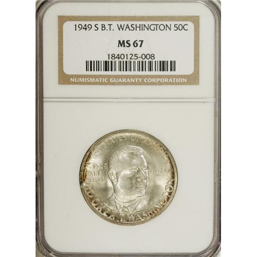 <B>1949-S 50C Booker T. Washington MS67 NGC.</B></I> In one of the Booker T. Washington Birthplace Memorial's better business ideas, the Memorial negotiated contracts with prominent dealers to offer 1,000 or more sets for sale. Many dealer-specific holders, however, are lost to time. This shimmering and slightly satiny Superb Gem has a touch of crimson at the edges, while the rest of the piece is silver-gray. Census: 29 in 67, 0 finer (4/07).<BR><I>From The Cary & Cheryl Porter Collection.</B></I><BR><BR><b>Shipping:</b> Coins & Currency (<a target="_blank" href="http://www.heritageauctions.com/common/shipping.php">view shipping information</a>)