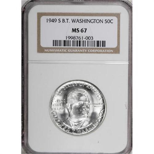 <B>1949-S 50C Booker T. Washington MS67 NGC.</B></I> An exquisitely preserved and blast-white Superb Gem that displays uncommonly strong luster and better striking quality than the average example. An excellent candidate for the discerning collector. Neither NGC nor PCGS has graded a numerically superior example (9/07).<BR><BR><b>Shipping:</b> Coins & Currency (<a target="_blank" href="http://www.heritageauctions.com/common/shipping.php">view shipping information</a>)