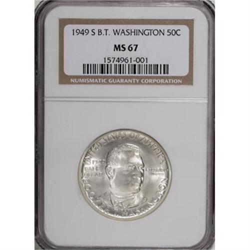 <B>1949-S 50C Booker T. Washington MS67 NGC.</B></I> Dazzling luster jumps out at the viewer of this Superb Gem. Crisply defined devices and impeccably preserved surfaces heighten the coin's outstanding eye appeal. Census: 32 in 67, 0 finer (1/08).<BR><BR><b>Shipping:</b> Coins & Currency (<a target="_blank" href="http://www.heritageauctions.com/common/shipping.php">view shipping information</a>)