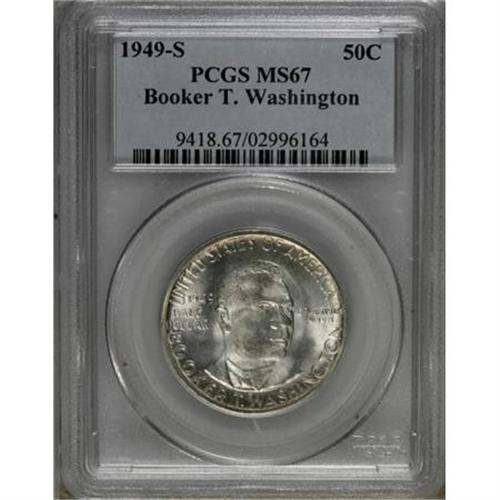 <B>1949-S 50C Booker T. Washington MS67 PCGS.</B></I> This is a wonderful Superb Gem commemorative that exhibits a veneer of low-intensity champagne-gold patina, sprinkled with olive-green along the borders. An exacting strike leaves strong detail on the design elements, and highly lustrous surfaces are devoid of significant marks. Population: 14 in 67, 0 finer (3/08).<BR><BR><b>Shipping:</b> Coins & Currency (<a target="_blank" href="http://www.heritageauctions.com/common/shipping.php">view shipping information</a>)