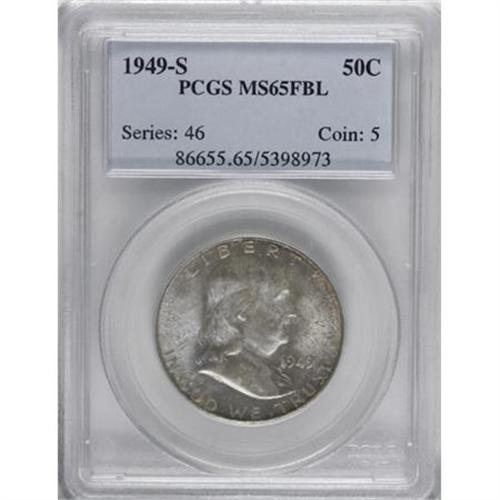 <B>1949-S 50C MS65 Full Bell Lines PCGS.</B></I> PCGS Population (399/116). NGC Census: (80/12). Numismedia Wsl. Price for NGC/PCGS coin in MS65: $320. (#86655)<BR><BR><b>Shipping:</b> Coins & Currency (<a target="_blank" href="http://www.heritageauctions.com/common/shipping.php">view shipping information</a>)