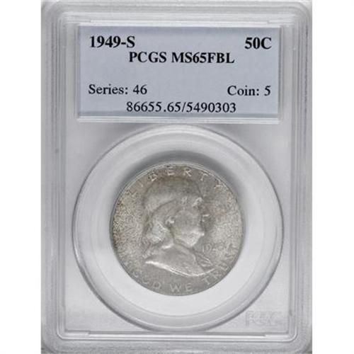 <B>1949-S 50C MS65 Full Bell Lines PCGS.</B></I> PCGS Population (403/119). NGC Census: (79/12). Numismedia Wsl. Price for NGC/PCGS coin in MS65: $320. (#86655)<BR><BR><b>Shipping:</b> Coins & Currency (<a target="_blank" href="http://www.heritageauctions.com/common/shipping.php">view shipping information</a>)