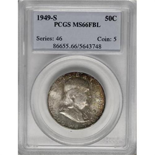 <B>1949-S 50C MS66 Full Bell Lines PCGS.</B></I> PCGS Population (115/3). NGC Census: (12/0). Numismedia Wsl. Price for NGC/PCGS coin in MS66: $650. (#86655)<BR><BR><b>Shipping:</b> Coins & Currency (<a target="_blank" href="http://www.heritageauctions.com/common/shipping.php">view shipping information</a>)