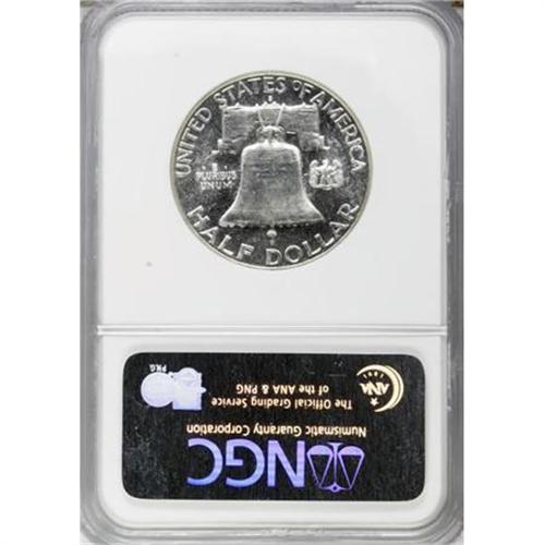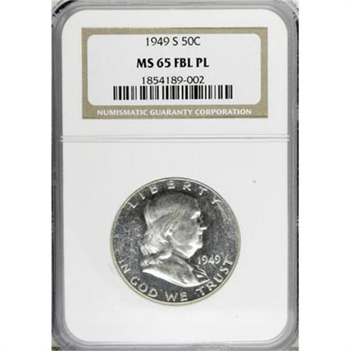 <B>1949-S 50C MS65 Full Bell Lines Prooflike NGC.</B></I> A fascinating Gem that displays crisp overall detail and surfaces that exhibit distinct reflectivity. Speckles of blue-violet patina appear at the margins, and the fields exhibit strong die polishing lines visible to the unaided eye. Formerly assigned the same grade by ANACS; insert and inner holder accompany lot.<BR><BR><b>Shipping:</b> Coins & Currency (<a target="_blank" href="http://www.heritageauctions.com/common/shipping.php">view shipping information</a>)
