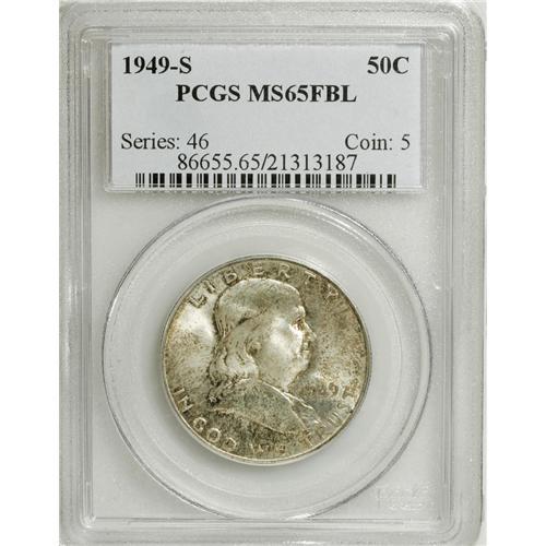 <B>1949-S 50C MS65 Full Bell Lines PCGS.</B></I> PCGS Population (393/115). NGC Census: (77/12). Numismedia Wsl. Price: $340. (#86655)<BR><BR><b>Shipping:</b> Coins & Currency (<a target="_blank" href="http://www.heritageauctions.com/common/shipping.php">view shipping information</a>)