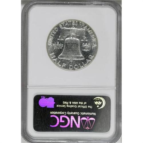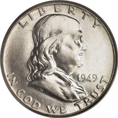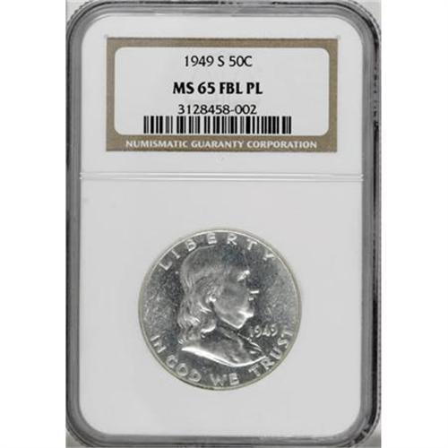 <B>1949-S 50C MS65 Full Bell Lines Prooflike NGC.</B></I> In the days before full bell lines became important to collectors, the 1949-S was considered the key to the series. It remains a scarce and popular low mintage issue. The present Gem has noticeably flashy fields, and abrasions are surprisingly inconsequential. NGC has certified a mere four Franklin halves as prooflike, three of which are 1959 Philadelphia examples without full bell lines. Thus, the present piece is the only branch mint or full bell line example certified as prooflike (3/08).<BR><BR><b>Shipping:</b> Coins & Currency (<a target="_blank" href="http://www.heritageauctions.com/common/shipping.php">view shipping information</a>)