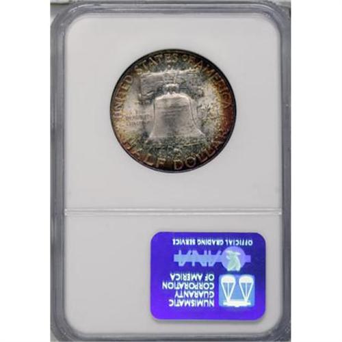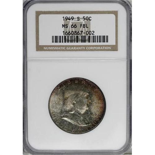 <B>1949-S 50C MS66 Full Bell Lines NGC.</B></I> Both sides of this solidly struck Premium Gem Franklin half offer rich patina over strong, lovely luster. Both sides show elements of rose and orange, while the obverse adds forest-green and sage to the mix. Census: 12 in 66 Full Bell Lines, 0 finer (1/08).<BR><BR><b>Shipping:</b> Coins & Currency (<a target="_blank" href="http://www.heritageauctions.com/common/shipping.php">view shipping information</a>)