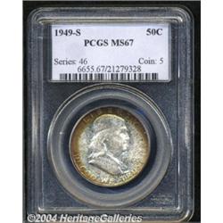 <B>1949-S<50C> MS67 PCGS.</B></I> Amazingly toned on the obverse and reverse, this Superb Gem shows a vivid concentration of amber and golden color around most of the peripheries with a mottled forest-green, lime-green, and antique-gold coloration in the centers. Rare this nice. Population: 2 in 67, 0 finer (7/04). <BR><BR><B>Important notice:</B> Heritage usually auctions material at the rate of 200-250 lots per hour. On some occasions eBay Live bid software or the Internet may not be able to keep up with the pace of the auction. We recommend placing a realistic absentee bid now as insurance to avoid disappointment. Occasionally the auctioneer may eliminate or reject an eBay Live bid, and the auctioneer may also reopen a lot after the close of the eBay live bidding (usually because we missed an audience bid), and may reject your bid even if it shows you as the winning bidder. By bidding via eBay Live, you agree that Heritage may award the lot to another bidder at its sole discretion under the circumstances described above or any other reasonable circumstances. Since eBay bids are not shown to us until we open the lot on the floor, we treat those bids just like floor bids. In most cases the floor responds before the eBay bid is presented to us, due to Internet lag time, so for consistency we have made it a policy that floor bids are always considered first over tie eBay live bids. Also please note that all Heritage lots purchased through eBay Live carry a 20% Buyer's Premium. Please make sure you read the Terms and Conditions before you bid. </span></font></tr></table></td></tr></table>