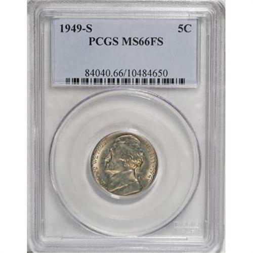 <B>1949-S 5C MS66 Full Steps PCGS.</B></I> Extremely lustrous, a foreshadowing of the coin's razor sharp detail. Rarely found with the quality of strike offered here. Population: 14 in 66, 1 finer (7/07).<BR><BR><b>Shipping:</b> Coins & Currency (<a target="_blank" href="http://www.heritageauctions.com/common/shipping.php">view shipping information</a>\)