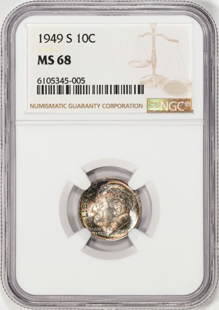 One 1949-S Roosevelt Dime Coin NGC MS68 Amazing Color. NGC Certified.