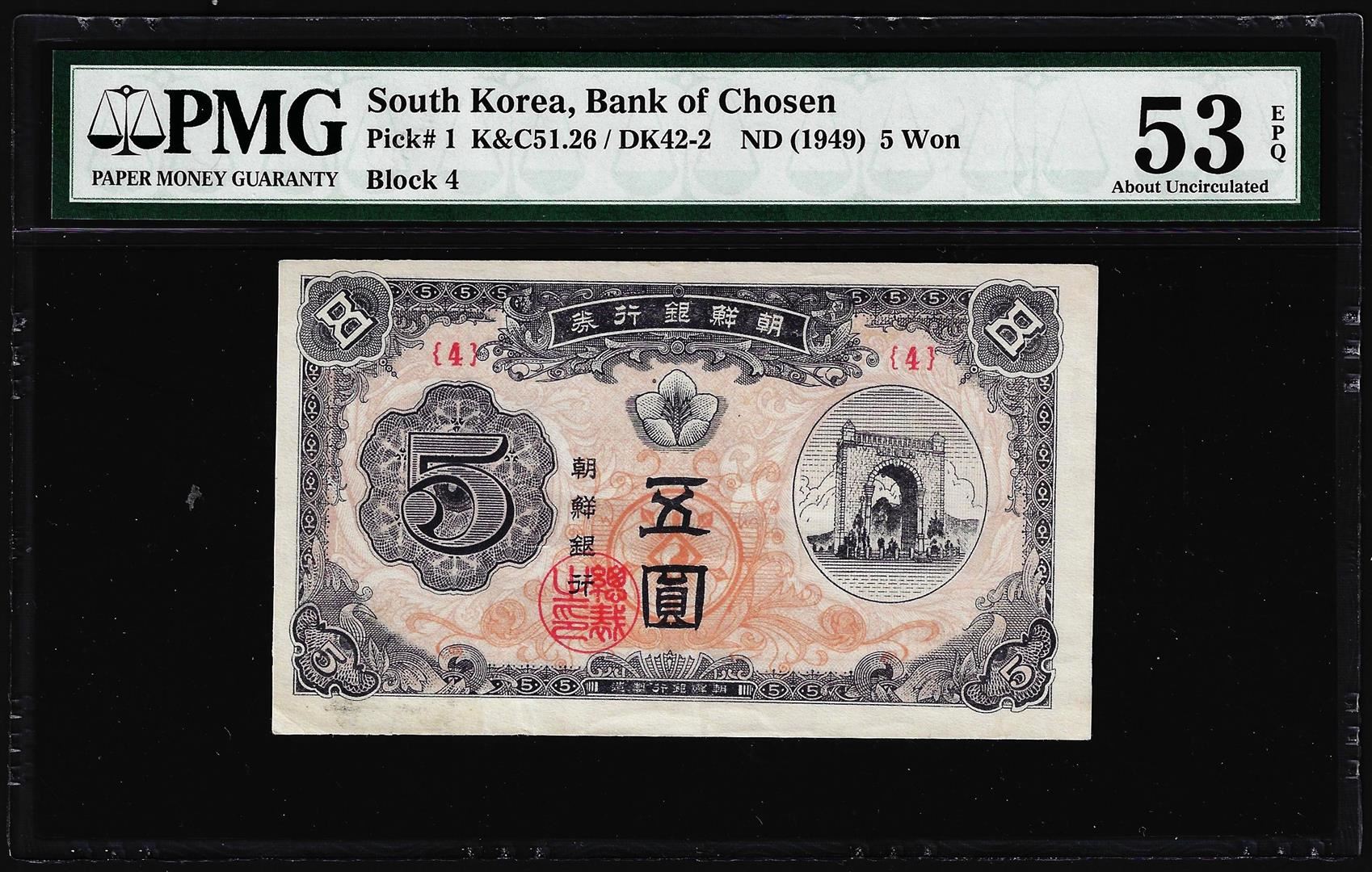 One 1949 South Korea Bank of Chosen 5 Won Note Pick# 1 PMG About Uncirculated 53EPQ. PMG Certified.