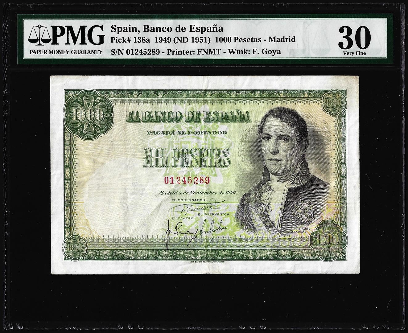 One 1949 Spain Banco de Espana 1,000 Pesetas Note Pick# 138a PMG Very Fine 30. PMG Certified.