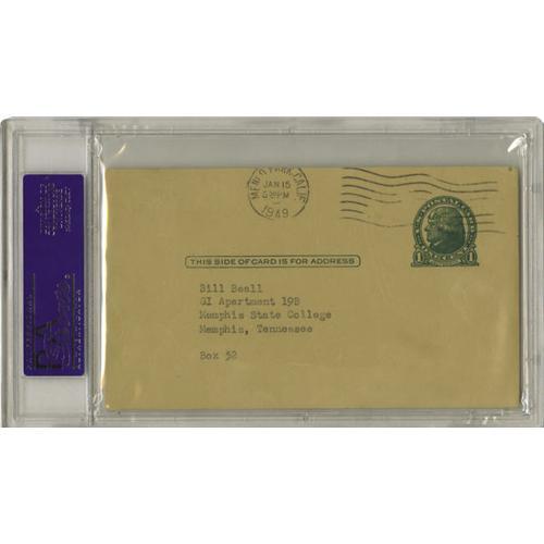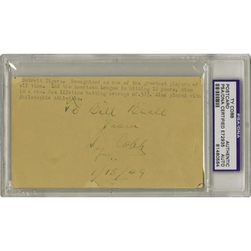 <B>1949 Ty Cobb Signed Government Postcard.</B></I> Widely despised for his ferocious nature as a ballplayer, Cobb was nonetheless a gracious and conscientious signer for autograph collectors in his later years. Here we find an example of that generosity, as he returned a government postcard to a fan with the inscription, "To Bill Beall from Ty Cobb, 1/15/49." The vintage green ink has mellowed slightly to 7/10 in strength, with the card toned an even shade. The postcard bears the postmark of Cobb's Menlo Park, California home, and a typed notation from the autograph collector above Cobb's signature recounts the highlights of his Hall of Fame career. Slabbed by PSA/DNA for protection and unquestioned authenticity. <BR><BR><B>Important notice:</B> Heritage usually auctions material at the rate of 200-250 lots per hour. On some occasions eBay Live bid software or the Internet may not be able to keep up with the pace of the auction. We recommend placing a realistic absentee bid now as insurance to avoid disappointment. Occasionally the auctioneer may eliminate or reject an eBay Live bid, and the auctioneer may also reopen a lot after the close of the eBay live bidding (usually because we missed an audience bid), and may reject your bid even if it shows you as the winning bidder. By bidding via eBay Live, you agree that Heritage may award the lot to another bidder at its sole discretion under the circumstances described above or any other reasonable circumstances. Since eBay bids are not shown to us until we open the lot on the floor, we treat those bids just like floor bids. In most cases the floor responds before the eBay bid is presented to us, due to Internet lag time, so for consistency we have made it a policy that floor bids are always considered first over tie eBay live bids. Also please note that all Heritage lots purchased through eBay Live carry a 22.5% Buyer's Premium. Please make sure you read the Terms and Conditions before you bid. This lot is being auctioned in conjunction with a live floor auction by Heritage Galleries & Auctioneers. All final auction and invoice information will be supplied by Heritage Galleries & Auctioneers, and all other information should be considered preliminary. Lot:19085 <BR><BR><B>Winning Notification and Billing:</B> After the FINAL session in this auction is complete, Heritage will send e-mail and snail mail invoices. This process normally takes several days. All final auction and invoice information will be supplied by Heritage Galleries & Auctioneers, and all other information should be considered preliminary. <BR><BR>This auction will be conducted on a live auction floor and over the Internet through eBay Live. If you choose to place an absentee bid, please take a moment to <font color='#0000ff'><u><a href='http://pages.ebay.com/liveauctions/help/before/laabsentee.html'>learn how eBay Live absentee bidding works</a></u></font><font color='#000000'>