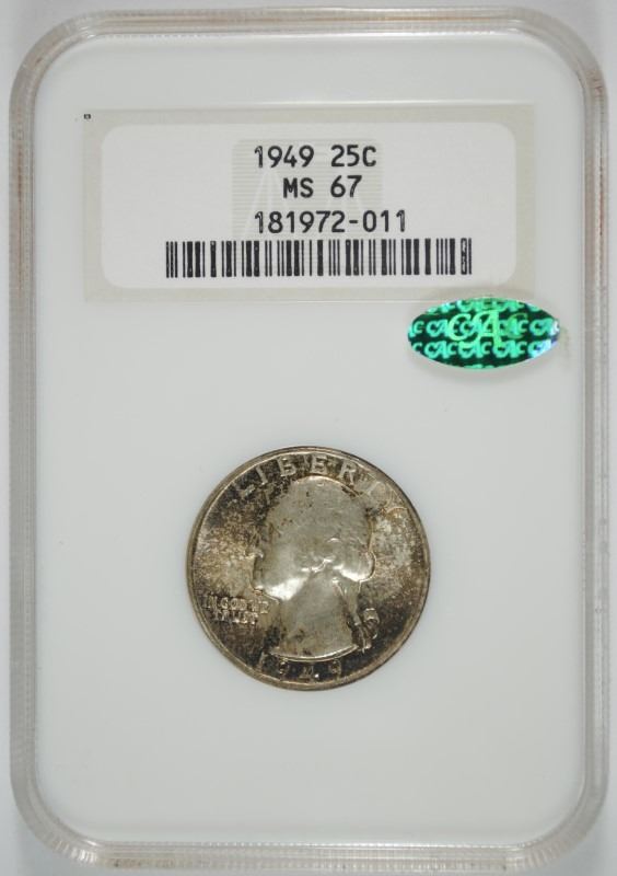 1949 WASHINGTON QUARTER, NGC MS-67!! CAC, TONED, ONLY 20 THIS GRADE WITH CAC!!!!