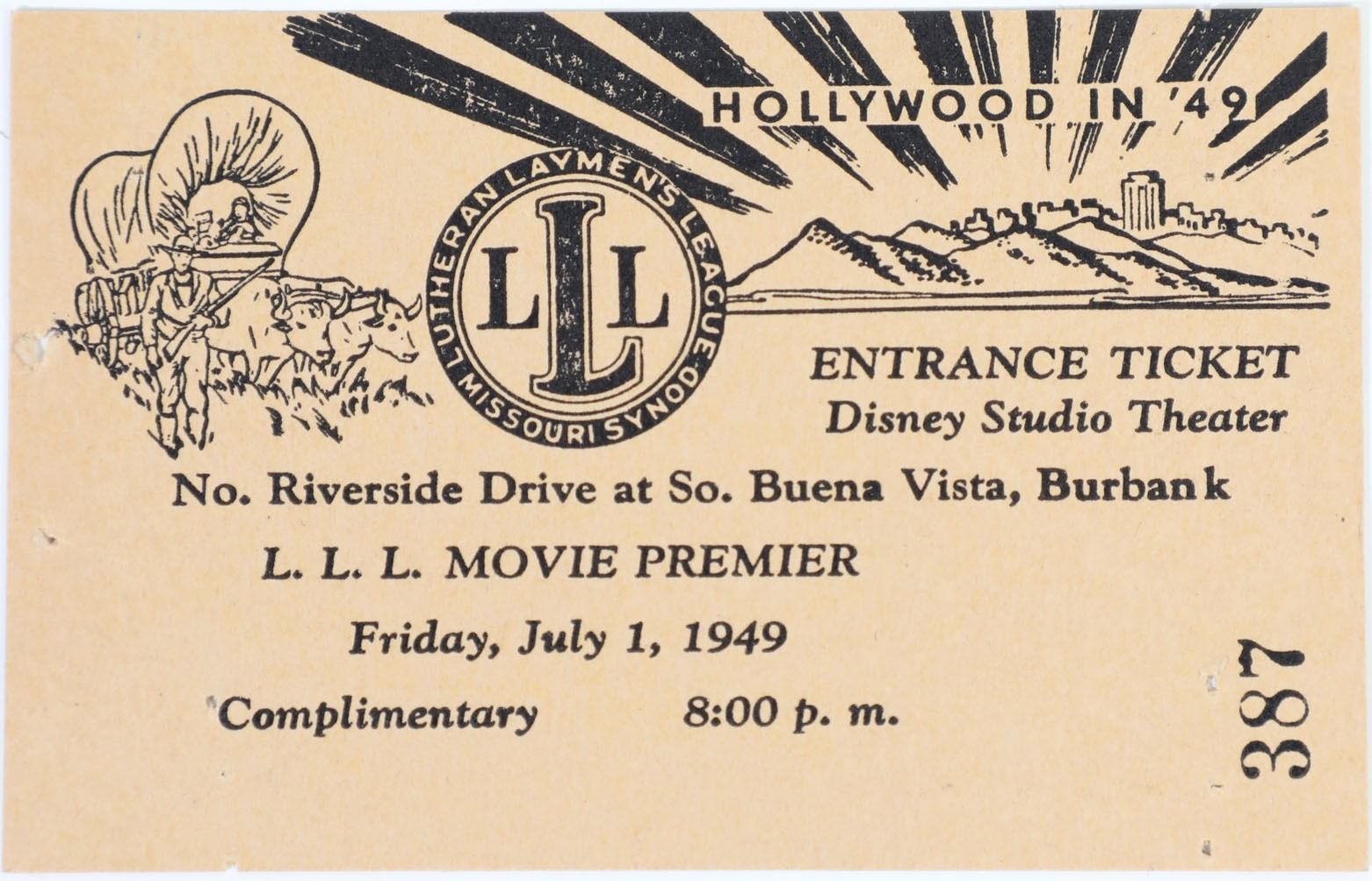 (Walt Disney Studios, c. 1949). A rare, vintage Walt Disney Studios Theater entrance ticket provided for the "L.L.L. movie Premiere." The ticket is in good condition with normal wear from age and use.