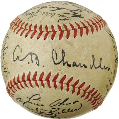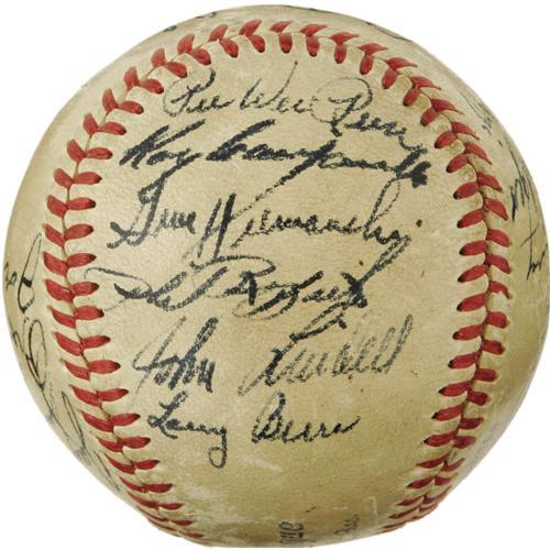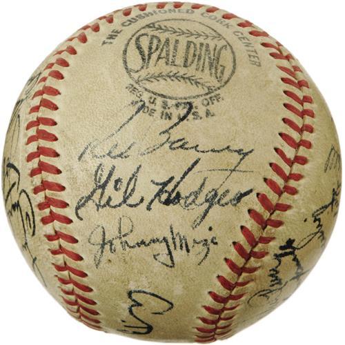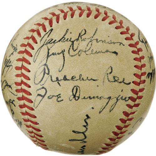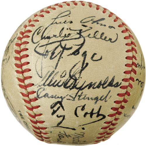 <B>1949 World Series Signed Baseball with Campanella, Robinson & Ty Cobb.</B></I> Exceptional array of Hall of Fame autographs is unlike anything you've ever seen before, as chronic October combatants the New York Yankees and the Brooklyn Dodgers join forces with Dead Ball legend Ty Cobb. Twenty autographs are here in total, retaining a majestic 9/10 average boldness against the lightly toned skin of this ONL (Frick) orb. The Cooperstown crew includes Cobb, Stengel, Reese, Campanella, Rizzuto, Mize and Jackie Robinson. Hall of Fame Commissioner A.B. "Happy" Chandler occupies the sweet spot. DiMaggio and Berra are also here, but in secretarial format. Other notables include Hodges, Roe and Reynolds. A special memento of a time when New York City ruled the baseball world, and the game's immortals populated its ranks. <I>LOA from PSA/DNA. LOA from James Spence Authentication.</B></I><BR><BR><b>Shipping:</b> Balls, etc. (<a target="_blank" href="http://www.heritageauctions.com/common/shipping.php">view shipping information</a>)
