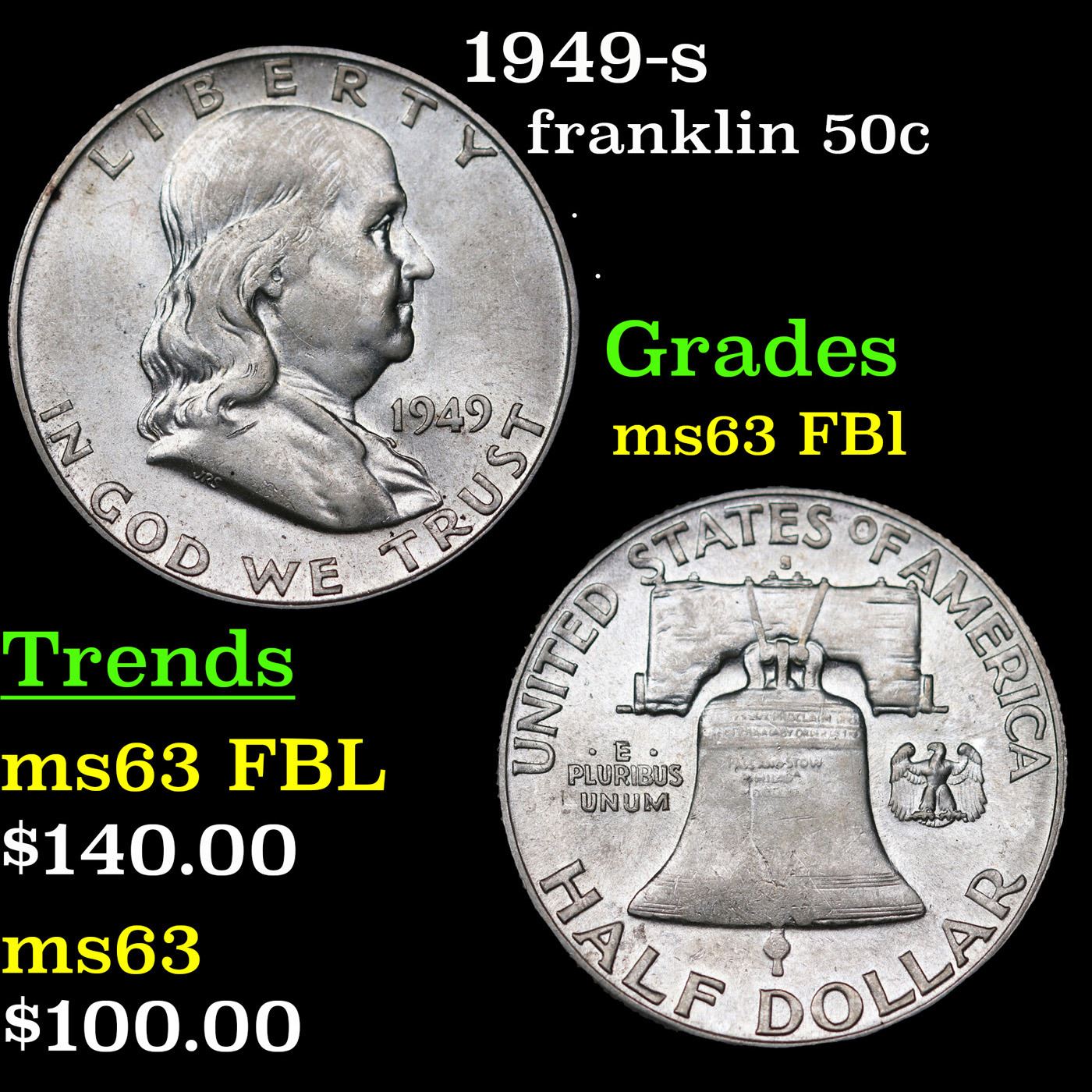 1949-s Franklin Half Dollar 50c Grades Select Unc FBL.