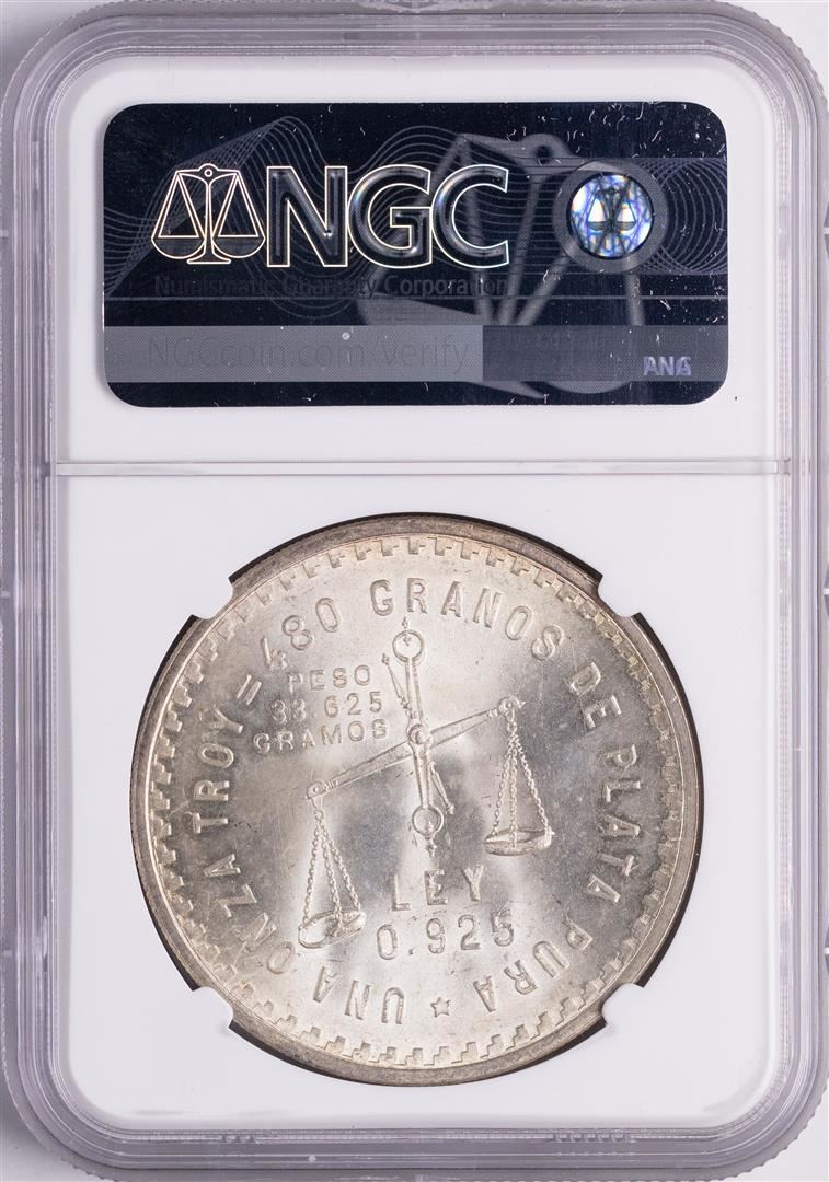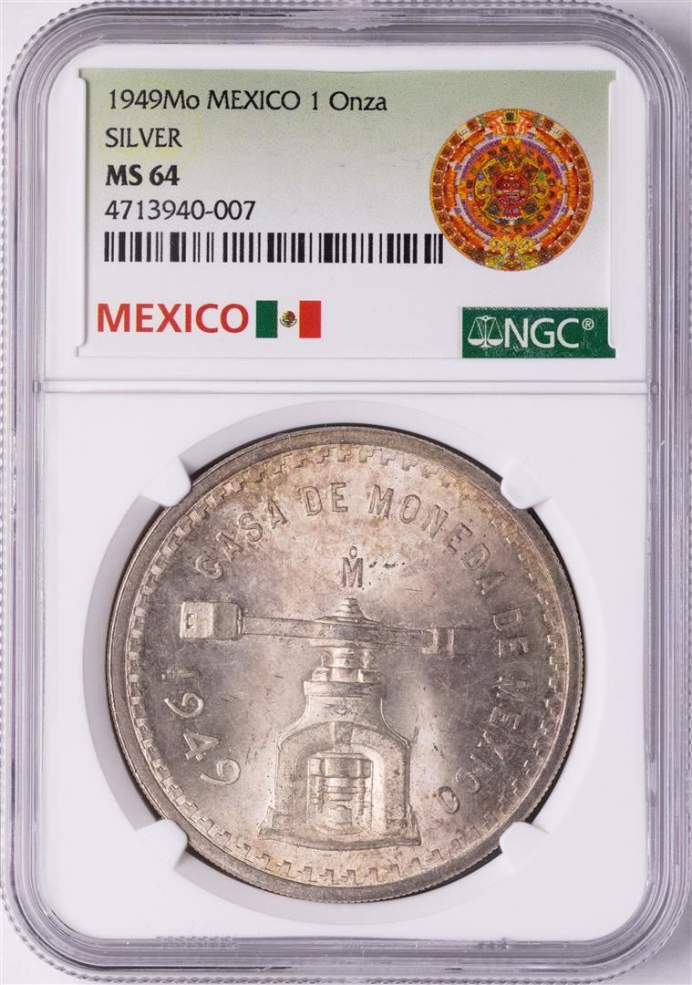 One 1949Mo Mexico 1 Onza Silver Coin NGC MS64. NGC Certified.