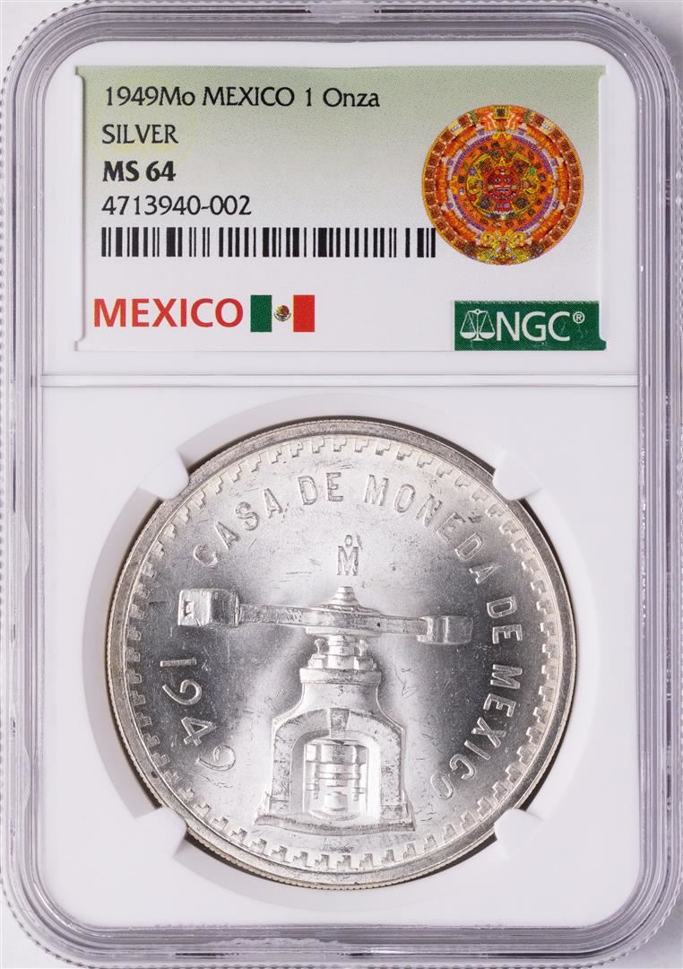 One 1949Mo Mexico 1 Onza Silver Coin NGC MS64. NGC Certified.
