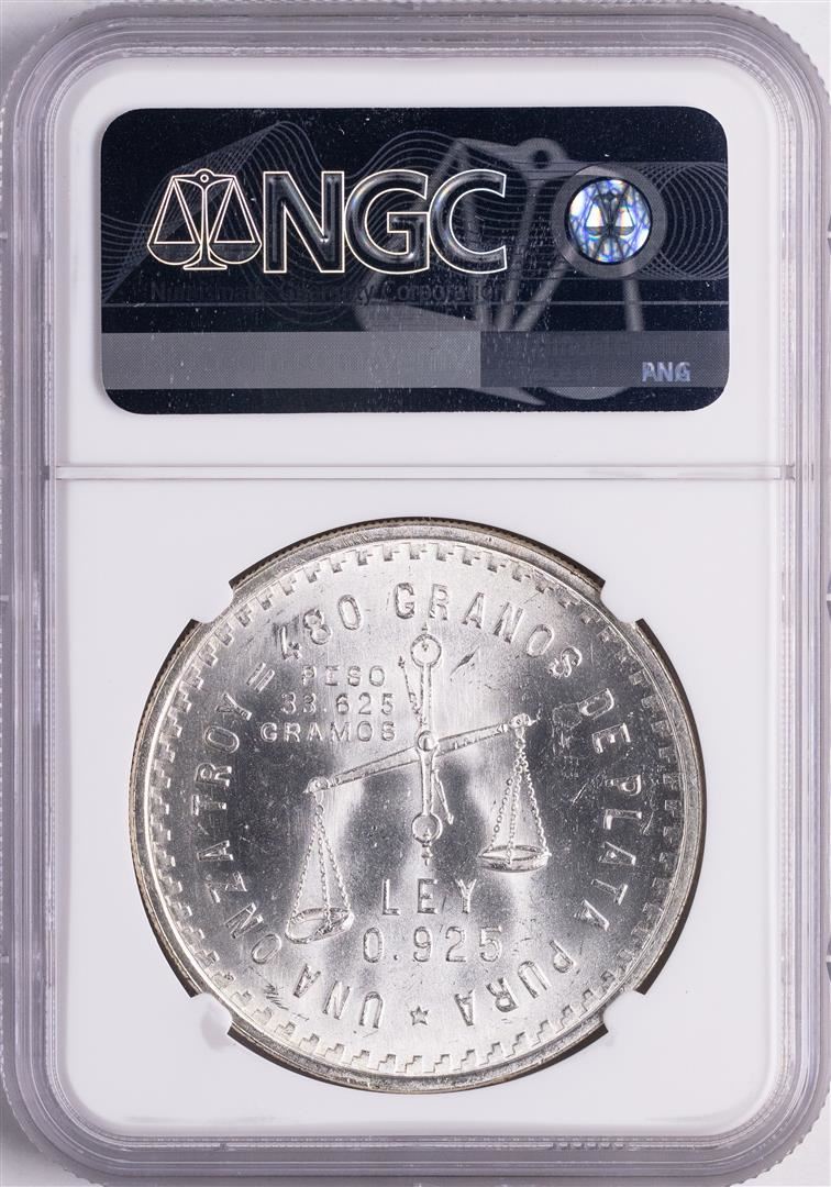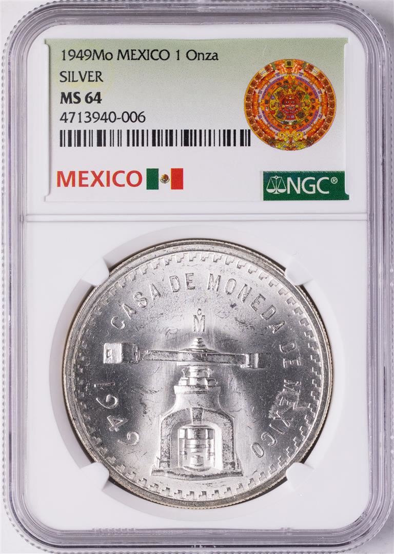One 1949Mo Mexico 1 Onza Silver Coin NGC MS64. NGC Certified.