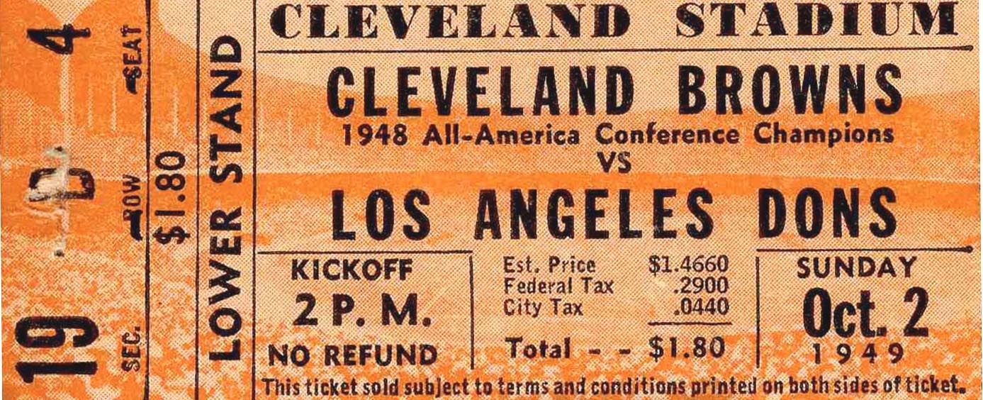 Cleveland Browns vs. L.A. Dons Full Ticket -- 2 October 1949, Cleveland -- Staple Marks, Else Near Fine