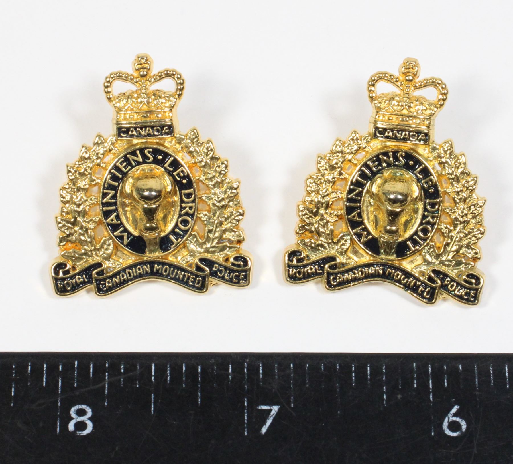 ROYAL CANADIAN MOUNTED POLICE COLLAR BADGE PAIR SOLID BACK WITH LUGS VARIATION QUEEN ELIZABETH II RCMP - CANADIAN LAW ENFORCEMENT INSIGNIA